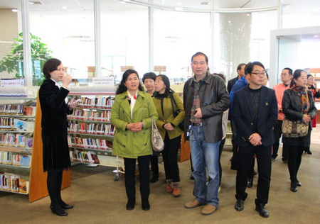 杭州图书馆副馆长何瑜英热情接待了考察组,并就杭州图书馆新馆建设、功能布局、物业管理、特色服务等作具体介绍。杭州图书馆新馆2008年建成并投入使用,总建筑面积4.38万平方米,设计中引入“以人为本”和绿色管理理念,通过大开间、软分隔、三重灯光等别具一格的空间设计,营造出独树一帜的家居式阅览环境,被誉为国内公共图书馆新馆建设的样板和典范。