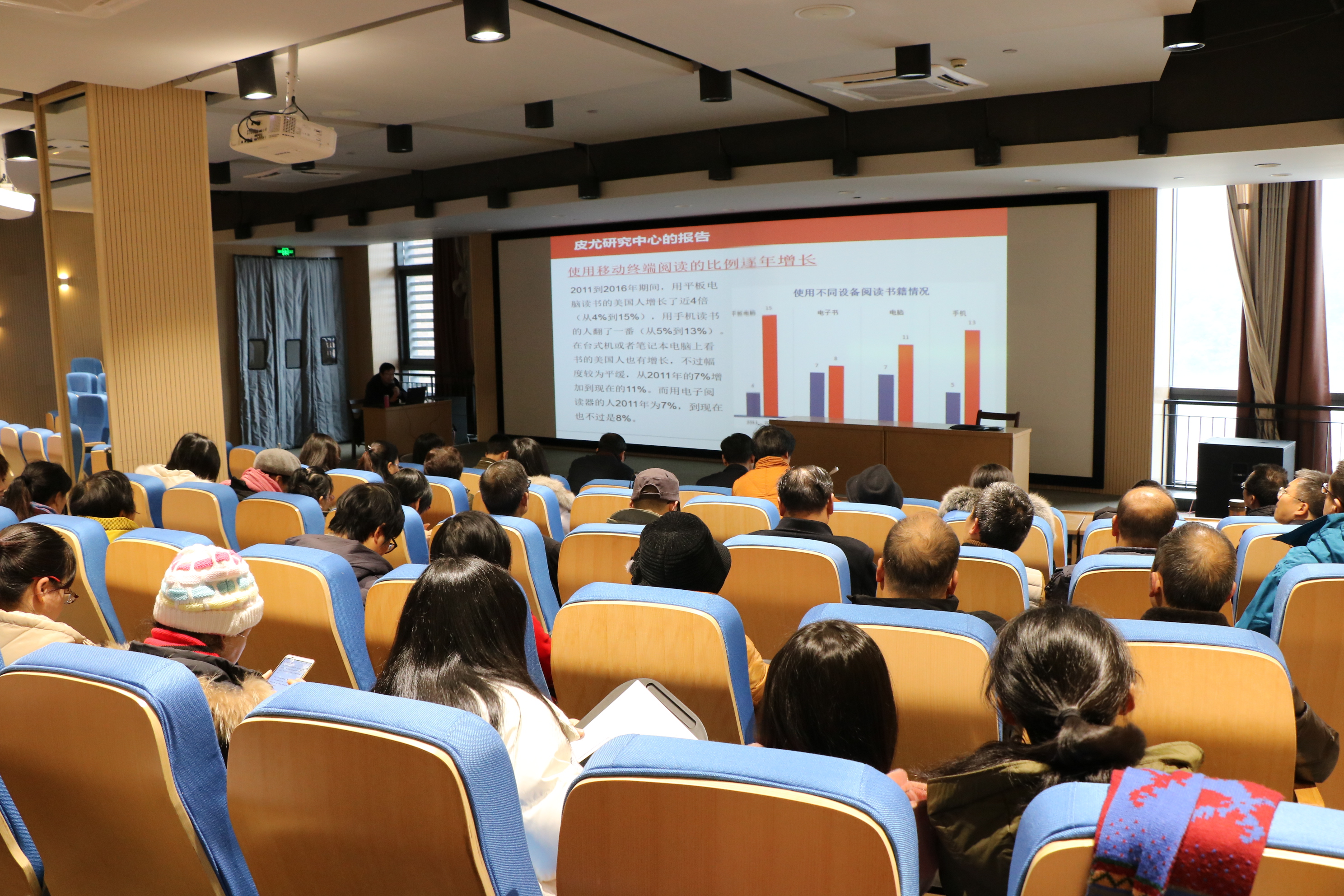 本次业务培训地点设在图书馆数字影音阅览室。郑洋从发展趋势、生态变化、生态要素、纸电一体、采购模式、推广活动等六方面介绍了电子书的现状、趋势及发展。内容以报告、数据为支撑,如《皮尤研究中心的报告》、《2015-2016年北京市全民阅读综合评估报告》等,并通过图片、表格等形式实现可视化呈现,具体、详实、清晰明了。