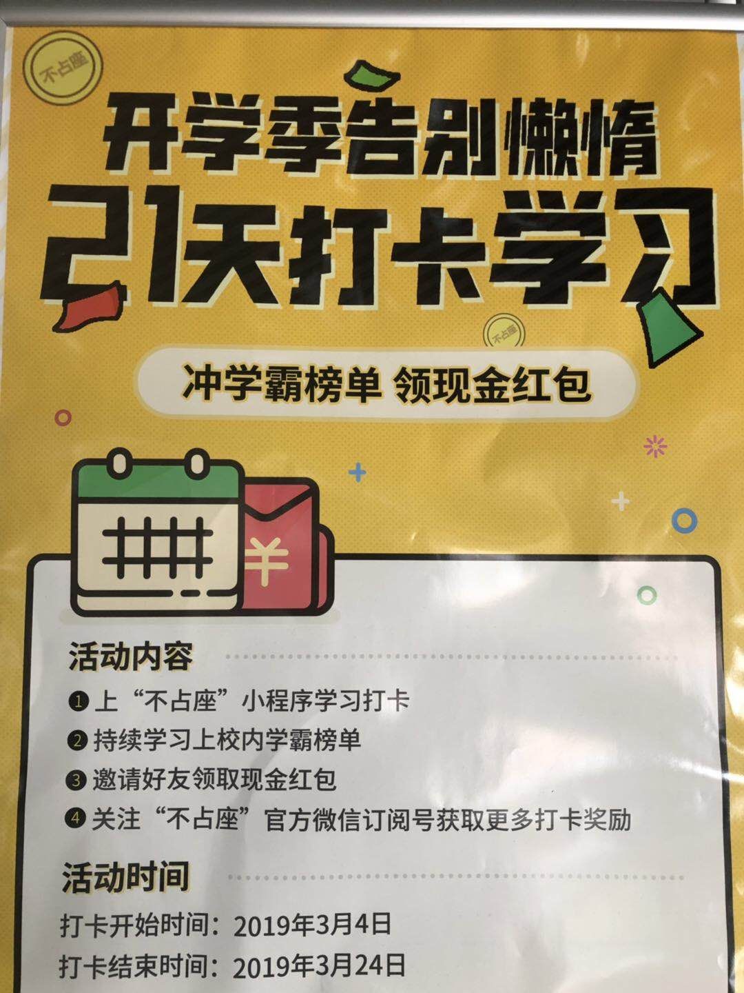 为配合学风建设,校图书馆联合校图书协会开展了“学习季告别懒散,学霸带你打卡”活动,并取得圆满成功。