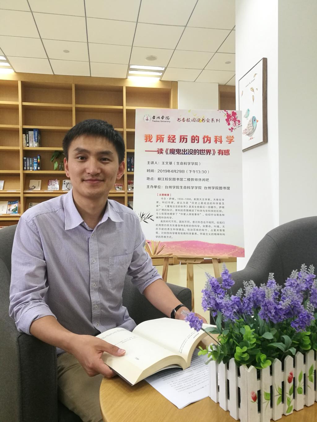 2019-4-29下午,由生命科学学院和图书馆主办的书香校园读书会在图书馆教师休闲吧举行。本期分享人为生命科学学院王文基老师,分享的主题是“我所经历的伪科学——读《魔鬼出没的世界》有感”。