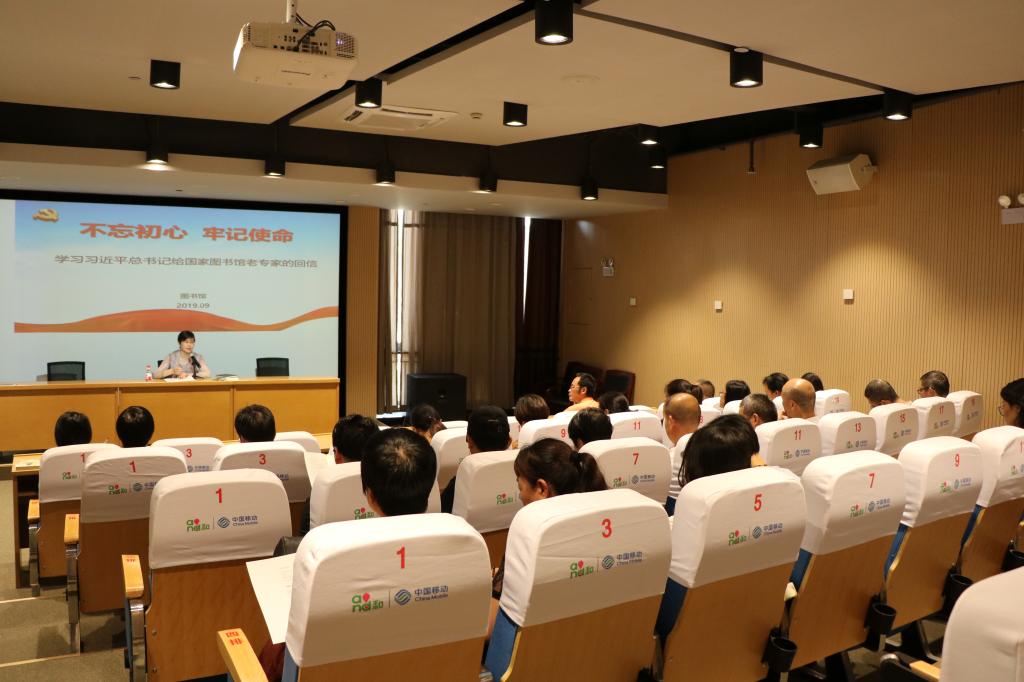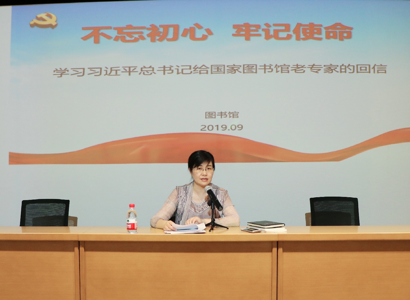 9月20日上午,图书信息党总支第一支部召开专题学习会议,组织学习《习近平给国家图书馆老专家回信》,把学习贯彻落实回信精神作为“不忘初心、牢记使命”主题教育活动的重要抓手,全体馆员参加学习会共同学习。会上,图书馆副馆长、图书信息党总支第一支部书记杨凌云全文传达了习近平总书记的回信,并作主旨发言。