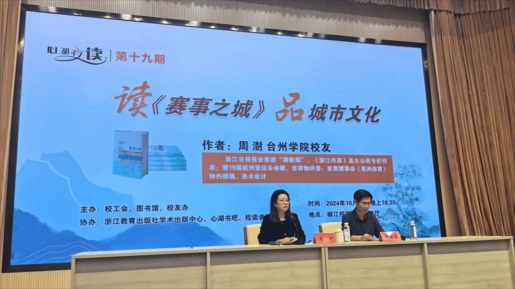 10月18日晚,校工会、图书馆、校办(校友办)在椒江校区国际会议厅联合举办第十九期“心湖夜读”:“读《赛事之城》 品城市文化”阅读分享会。该书作者、我校中文系校友周澍亲临现场分享交流,200余名师生参加活动。分享会由校工会主席王金宝主持。