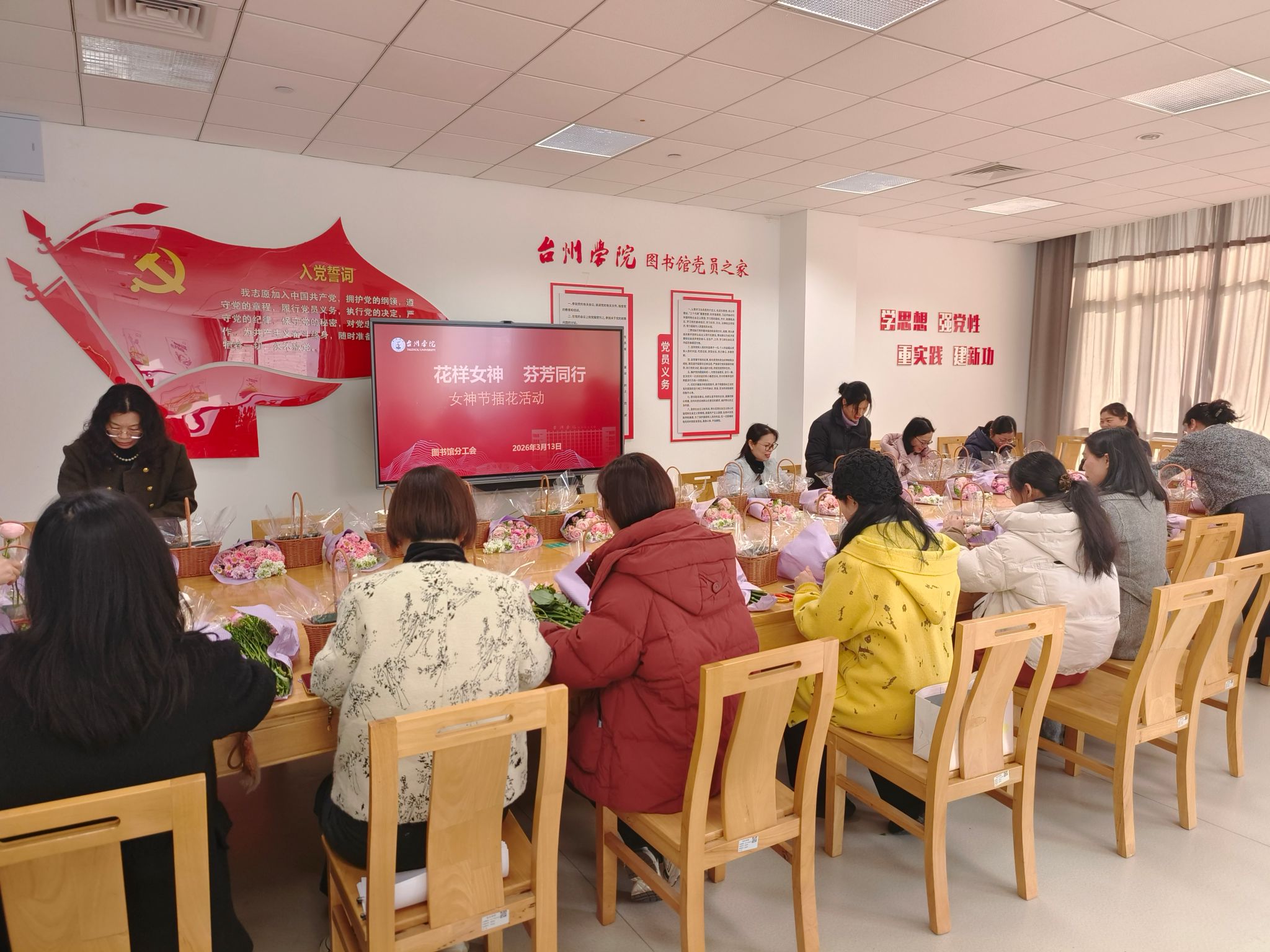 阳春三月,花香满室。为庆祝第116个“三八”国际劳动妇女节,丰富女教职工的精神文化生活,3月13日,台州学院图书馆分工会在椒江校区图书馆工会之家开展了以“花样女神 芬芳同行”为主题的插花艺术活动,全馆女教职工欢聚一堂,在花香中共赴一场春日的美丽约会。